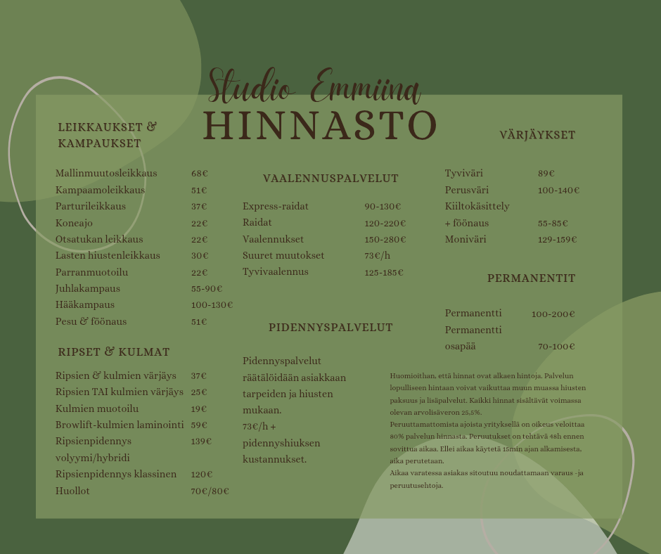 Studio Emmiinasta löydät iloiset ja innovatiiviset naisyrittäjät – Emmin ja Sallan, jotka haluavat palvella kaikkia ammattitaidolla ja luoda juuri sinulle sopivan palvelukokonaisuuden parturi-kampaamo, ripsienpidennys -ja hiustenpidennyspalveluistamme.